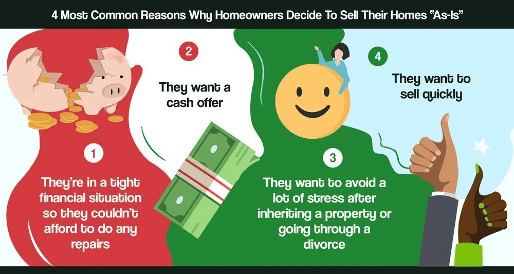 Many people sell their houses as is because they want to attract cash buyers. Many of these buyers are local investors and flipping companies who purchase fixer-uppers or ugly homes and renovate them. Likewise, sellers generally love a cash offer because it helps expedite the home sale process. They get paid faster and use the quick cash to settle debts or spend it on other expenses.