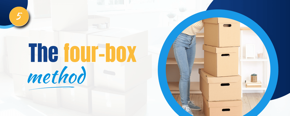 As the name suggests, all you need here are four empty boxes that you will label with their purpose. While there are some variations, most experts include the following: keep, trash or throw away, donate, and sell. Other variations also include ‘rehome' and ‘undecided.’
