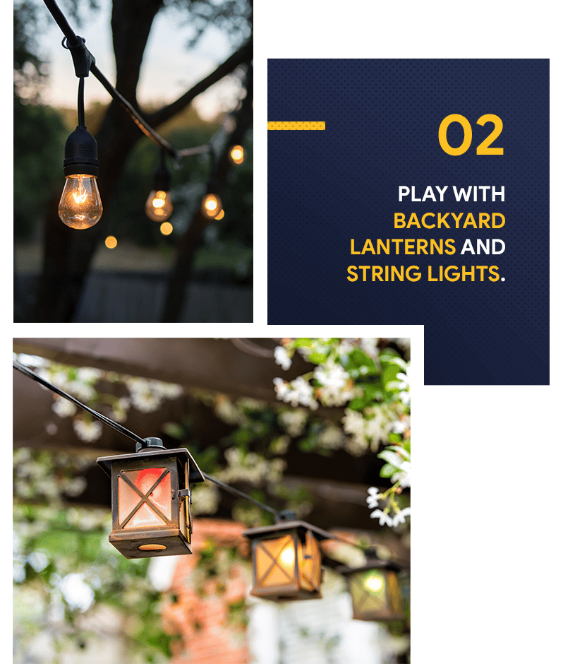 One way to embrace outdoor living and make your space an extension of your living room is to invest in additional lighting. Luminous decorations, such as floor or table lamps and lanterns, will not only brighten up your backyard but will also add interest to it. Just make sure to choose lamps that are designed for the outdoors and are weatherproof. Another brilliant idea is hanging pretty string lights across an entire space or along a fence to give your yard a rustic vibe.