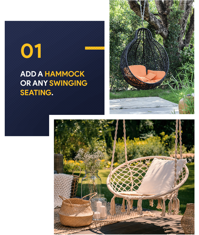 A hammock or any swinging chair is a simple way to update your backyard. They take up less space, and there are plenty of designs and styles to choose from that will work in almost any setting. It's also a great choice if you want to achieve that beachy vibe using a decorative accessory. Whether you put it on your porch, terrace, or patio, a hammock’s easy swinging motion is calming and it can be a relaxing way to end your day.