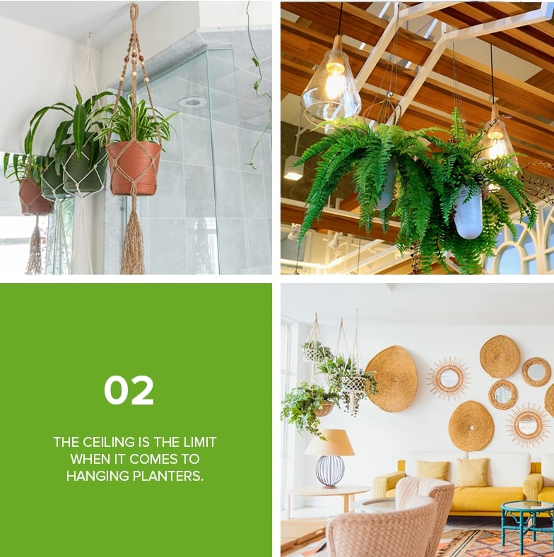 Love plants but don't think you have any extra floor space? Well, the sky (or the ceiling) is the limit! Creating a garden in the air can instantly add a dreamy, bohemian look in your space. Also, setting up hanging planters at varying heights is an unexpected way to add color and visual interest. Hanging plants are also perfect if you have pets or small children and you’re afraid of them grabbing the plants on the floor or tabletop, especially since there are some plant varieties that could be poisonous to them when eaten.