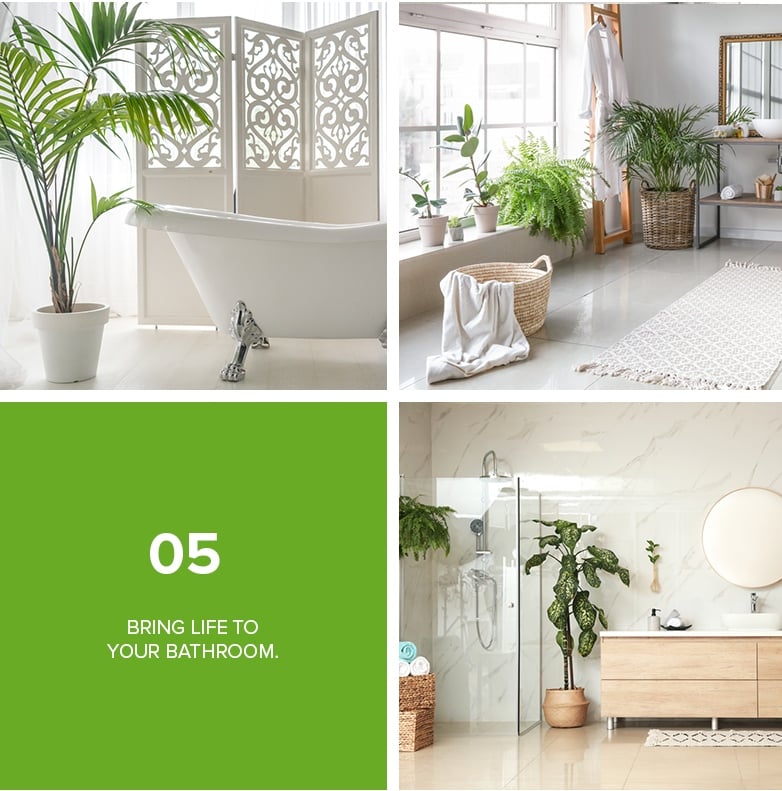 Plant life can pop in many areas of your home—even in your restroom. Especially if you're looking for ways to improve the look of your boring bathroom, adding a few potted plants can add a soft, warm layer to all the hard materials. Some plants that will feel perfect in a bathroom or walk-in shower include peace lily, sansevieria or snake plant, and spider plant. The bonus is, even if you think you have a black thumb, these plants will thrive in low light and warm temperatures. Also, the moisture created from your daily bath can help your leafy friend stay alive even with less effort.