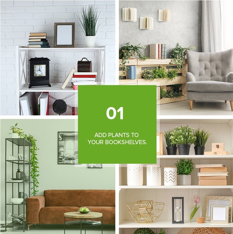 Bookshelves aren't just for books, framed photos, and other displays and accessories. If you haven’t considered this yet, try including a plant or two to your bookcase to enrich the space and add some texture. If you want to go beyond the succulents or small potted plants, place a trailing plant on the top of the shelf to add a “living layer” and create visual interest.