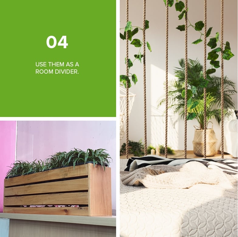 One practical way to incorporate plants into your home is to use them as a room divider. They make attractive dividers especially on houses with open floor plans or layouts, and on studio apartments where you need to create defined areas within the room. Using plants is also a great way to maximize natural light and space.