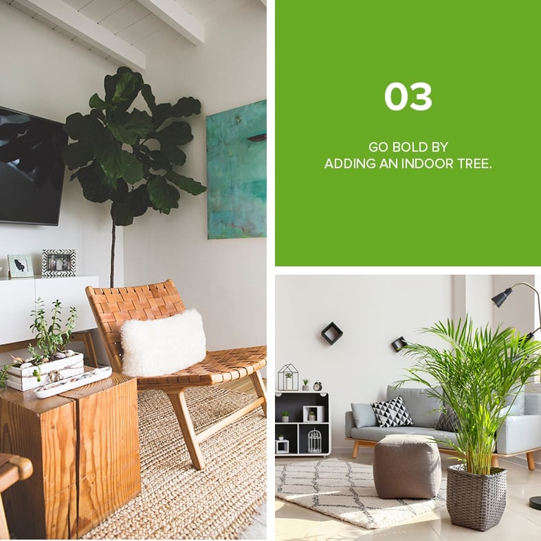 Want to try something different? Go over the top with an enormous potted tree that can add a burst of life to your space. It's perfect if you are already tired and bored of the usual small house plants, you have a minimalist home, or if you don’t have enough space or budget for lots of plants.