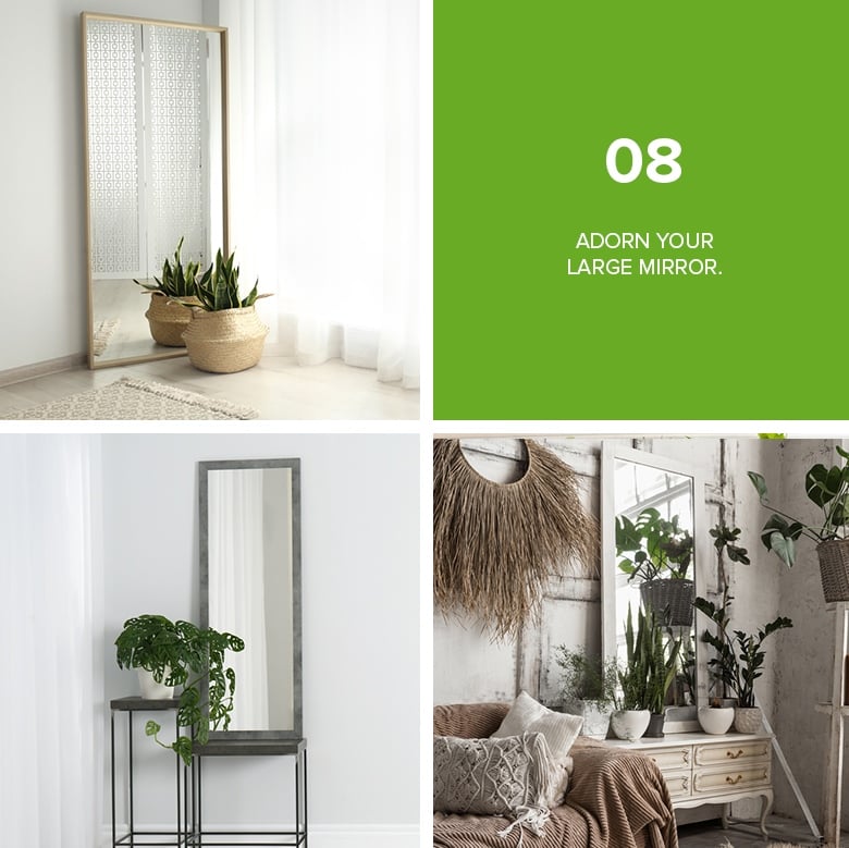 Mirrors can make a room look larger and feel more open. However, large mirrors can at times be distracting. To counterbalance the effect, place a few tiny plants or cute topiaries in front of it. You can use plant pots or containers that match the color of your mirror frame for a more harmonious effect.